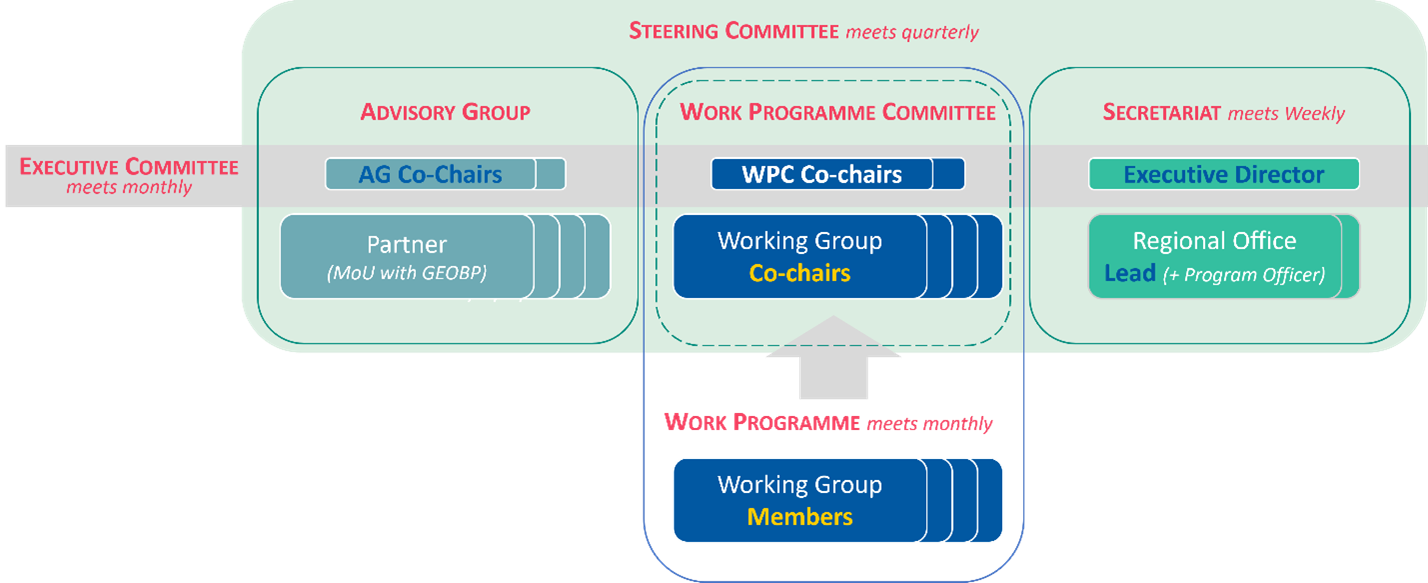 GEO Blue Planet is governed through a multi-tiered structure designed to ensure strategic alignment, operational efficiency, and inclusive participation.