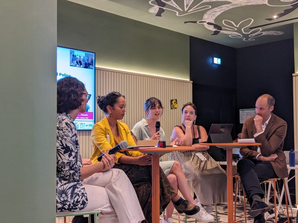 From right to left, Dr Ludovic Mollier (IRD), Lucie Rossin (UNEP/SPAW-RAC), Gabrielle Larricq (Government of France), Jane Nurse (Global Gateway), and Dr Audrey Hasson (GEO Blue Planet) (out of shot), and Charlotte Gully (Ademe)